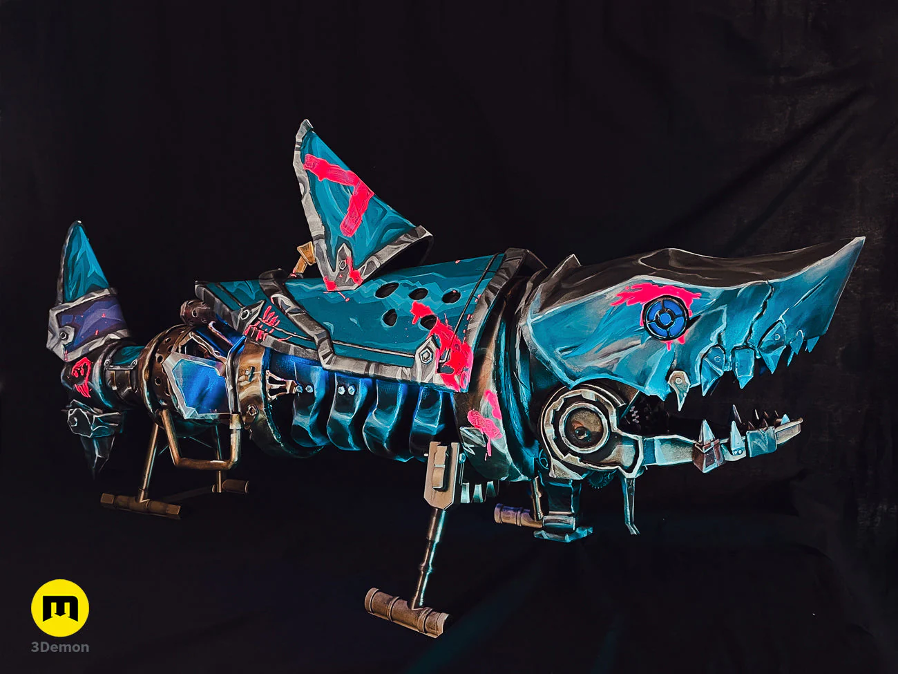 A digital 3D printable model of Jinx's rocket launcher, Fishbones, with an opening jaw from Netflix's Arcane: League of Legends.