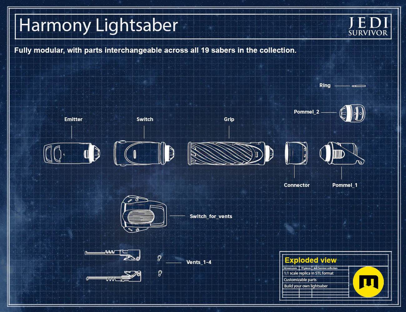 • STL files for each lightsaber part that can be swapped and combined with other lightsabers in the collection.