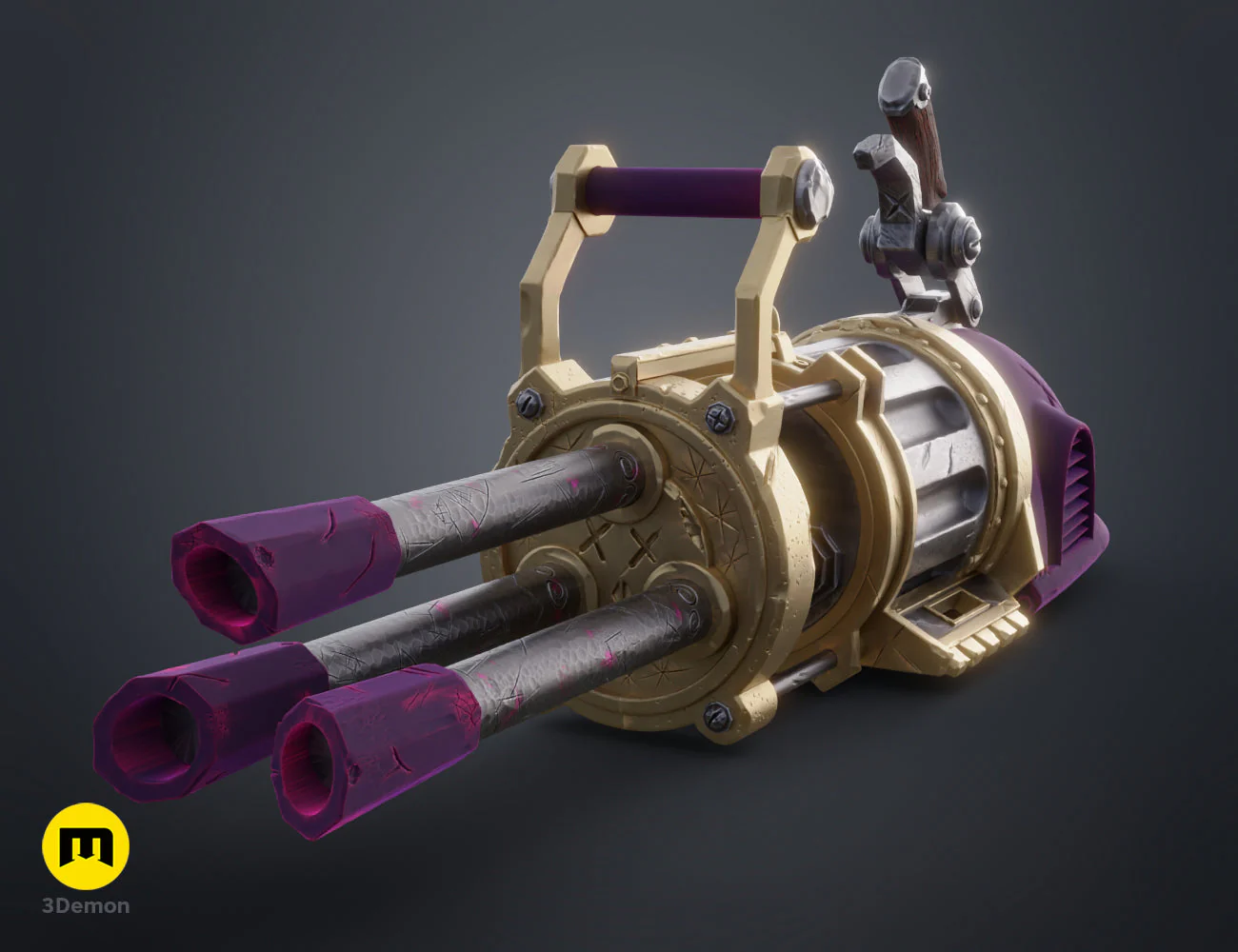This is a digital 3D printable model of Jinx Pow-Pow Minigun from Arcane. The drum of the minigun is mounted on an axle, which allows the barrel to rotate when you push it.
