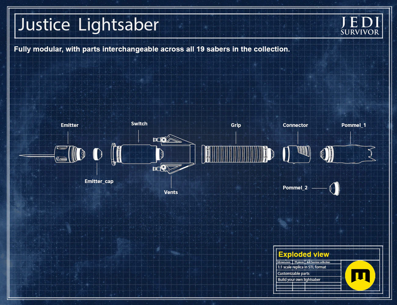 • STL files for each lightsaber part that can be swapped and combined with other lightsabers in the collection.