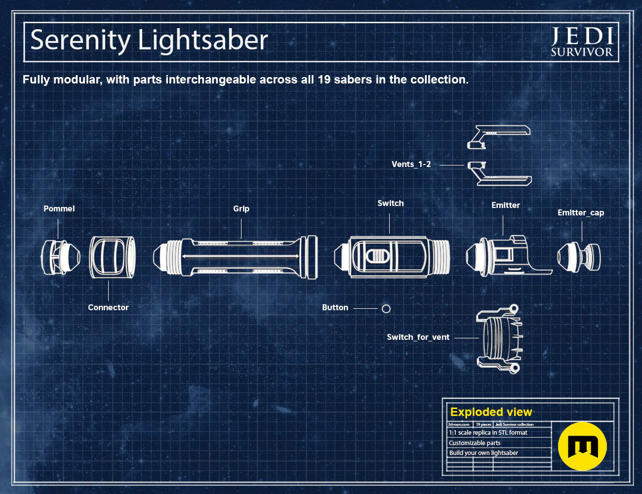 • STL files for each lightsaber part that can be swapped and combined with other lightsabers in the collection.